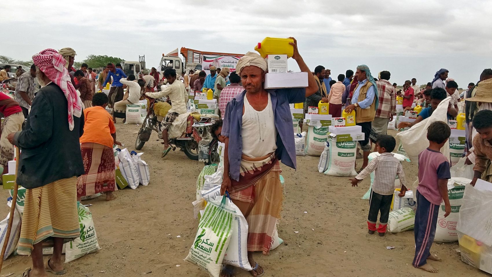 People displaced by conflict receive food aid from a Kuwaiti charity at a village in Yemen in February 2021.