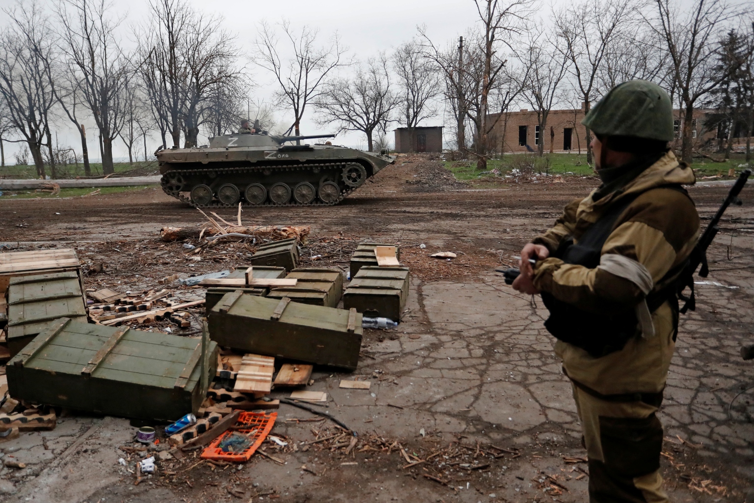 Pro-Russian troops ride an armoured vehicle near a Azovstal metal works plant in Mariupol on April 12, 2022.