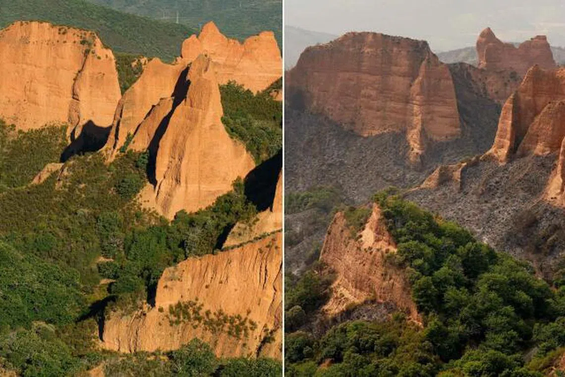 The Roman-era mining site of Las Medulas in the municipality of Carucedo, photographed on Sept 4, 2024 (left), and on Aug 11, 2025, after a wildfire ravaged the area.