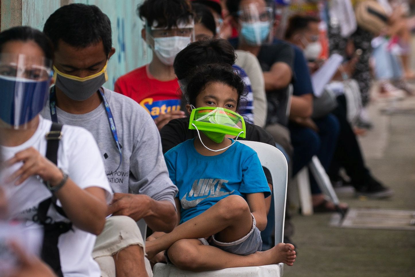 A child wears a mask as people wait to be tested for coronavirus at a government facility in the Philippines.