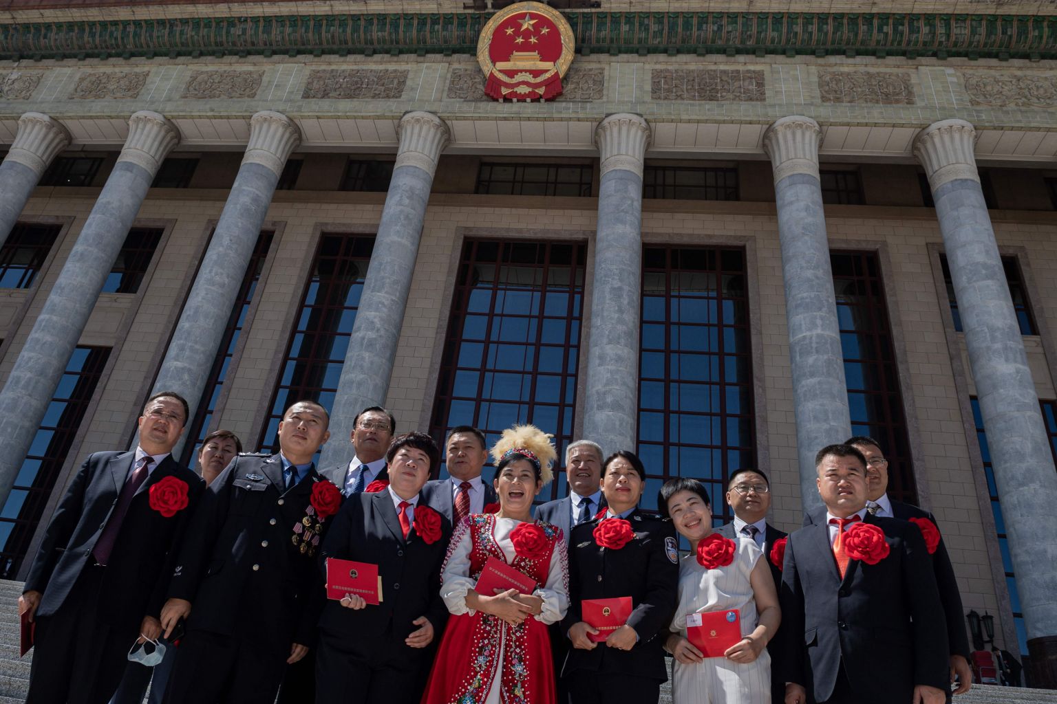 People pose with their awards at the end of a ceremony in China to honour those who fought the coronavirus pandemic.