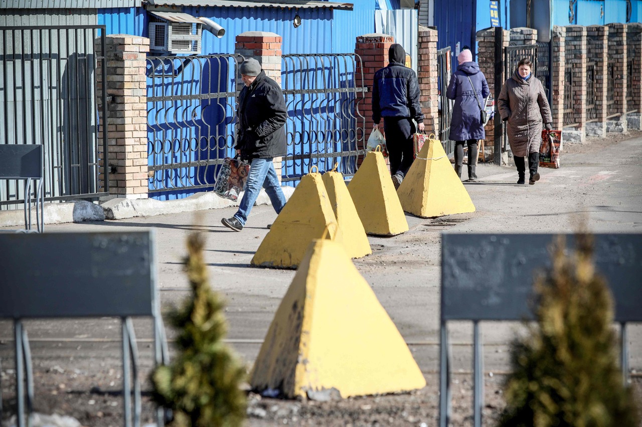 People walk past anti-tank barriers in the Donetsk region town of Avdiivka on Feb 21, 2022.