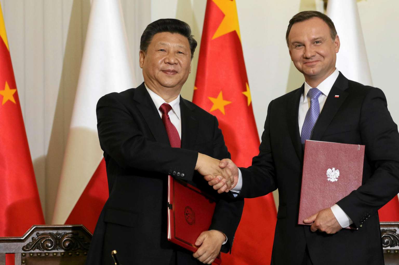 Chinese President Xi Jinping (left) and his Polish counterpart Andrzej Duda at the signing of a cooperation treaty between the two countries in Warsaw, on June 20, 2016.