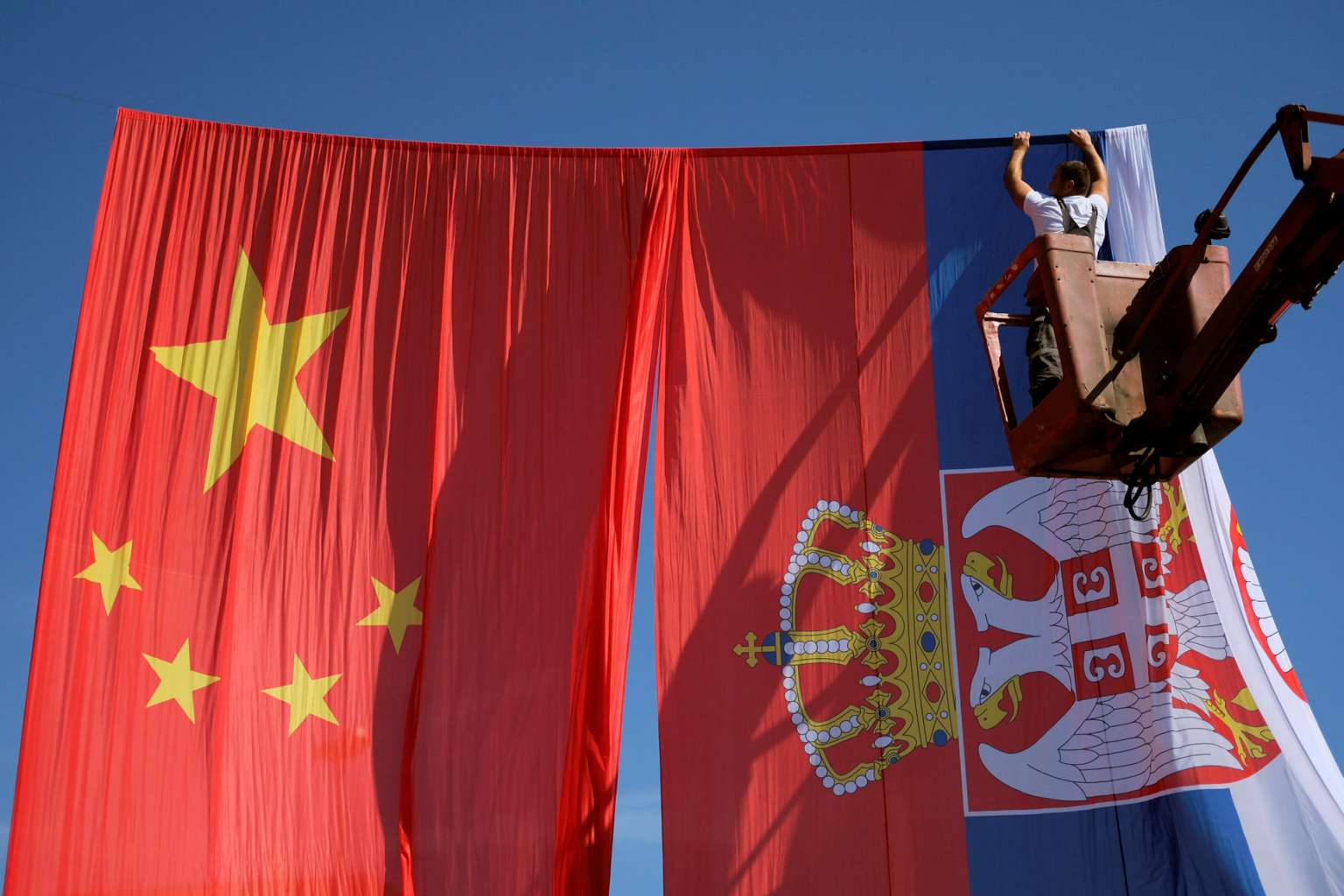 A worker adjusts Chinese and Serbian flags for the upcoming visit of Chinese President Xi Jinping, in Belgrade, Serbia, on June 16, 2016.