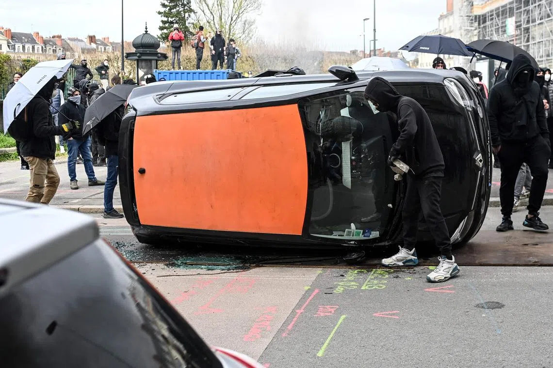 A tipped-over car is destroyed by protesters on the sidelines of a demonstration against pension reform, in Nantes, western France, on March 28, 2023. AFP)