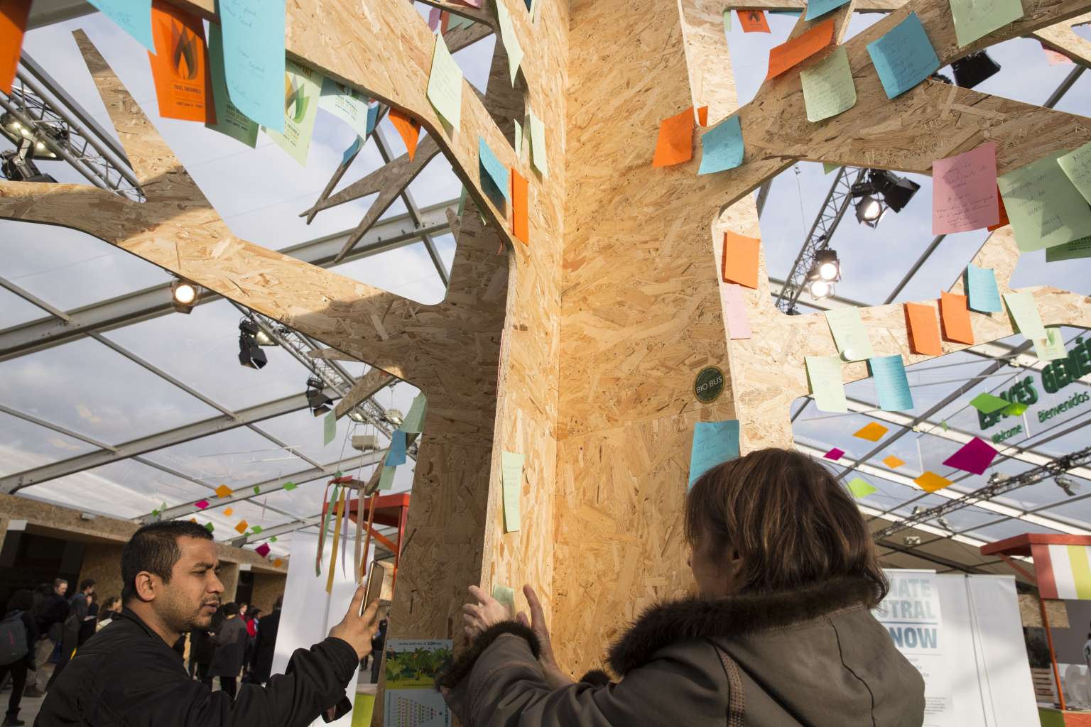 Attendees stick message notes on a tree sculpture at the United Nations COP21 climate conference.