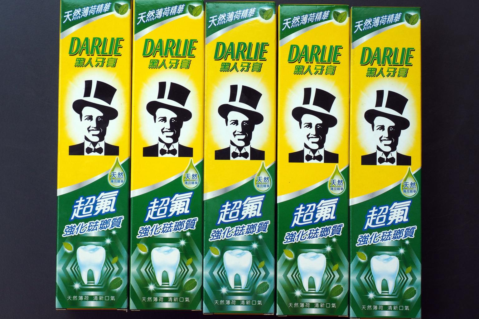 Darlie is a Chinese brand owned by Colgate and its joint venture partner Hawley & Hazel. Its package features a smiling man in a top hat. Its previous name was Darkie, and featured a man in blackface.