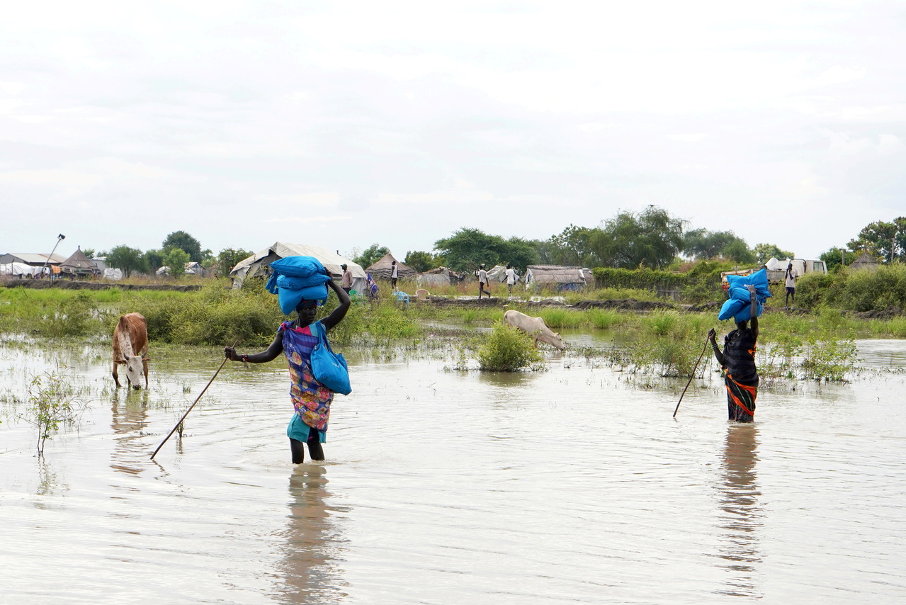 A photo from 2019 showing women walking through a flood in Boma, South Sudan.