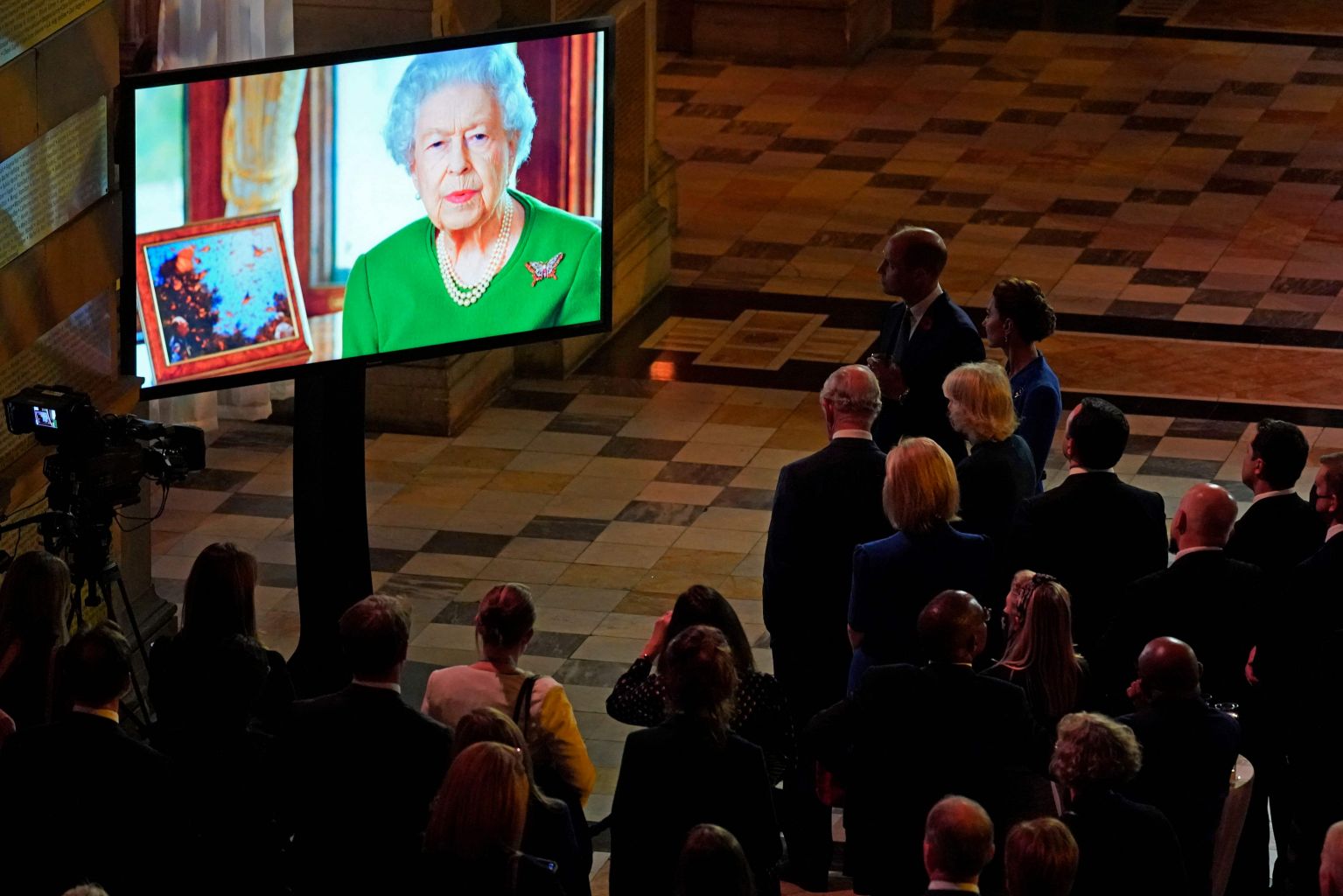 Attendees watch a video message from Britain's Queen Elizabeth at the COP26 UN Climate Change Conference in Glasgow, on Nov 1, 2021.