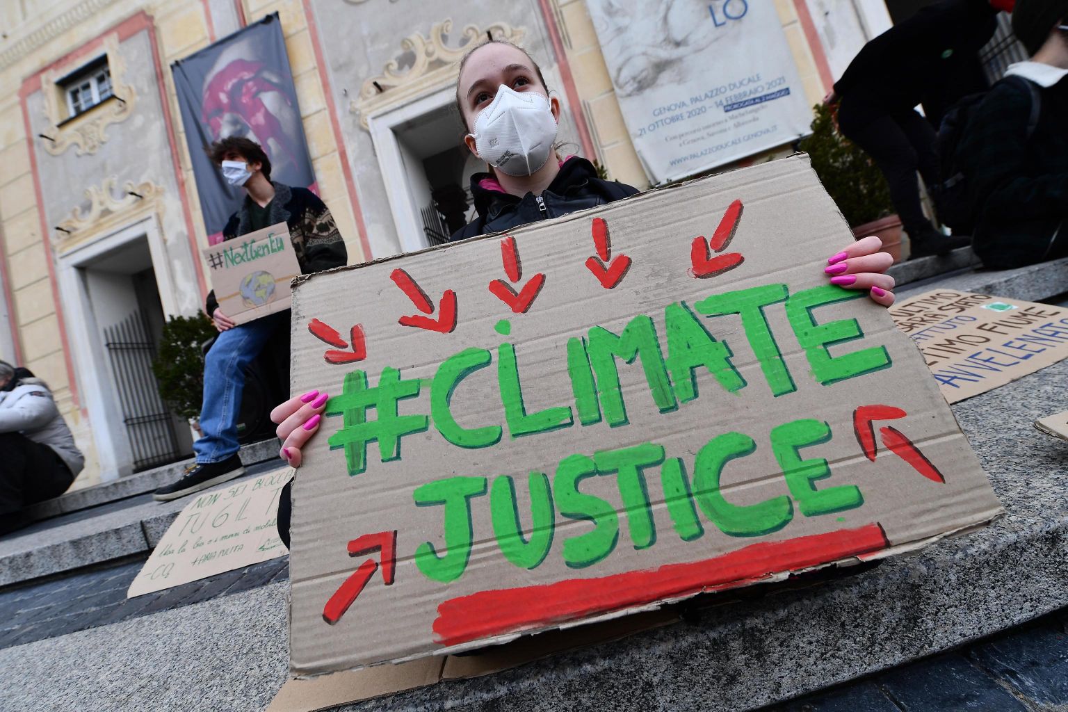 Activists gather with banners during a Fridays for Future demonstration against climate change in Italy, March 19, 2021.