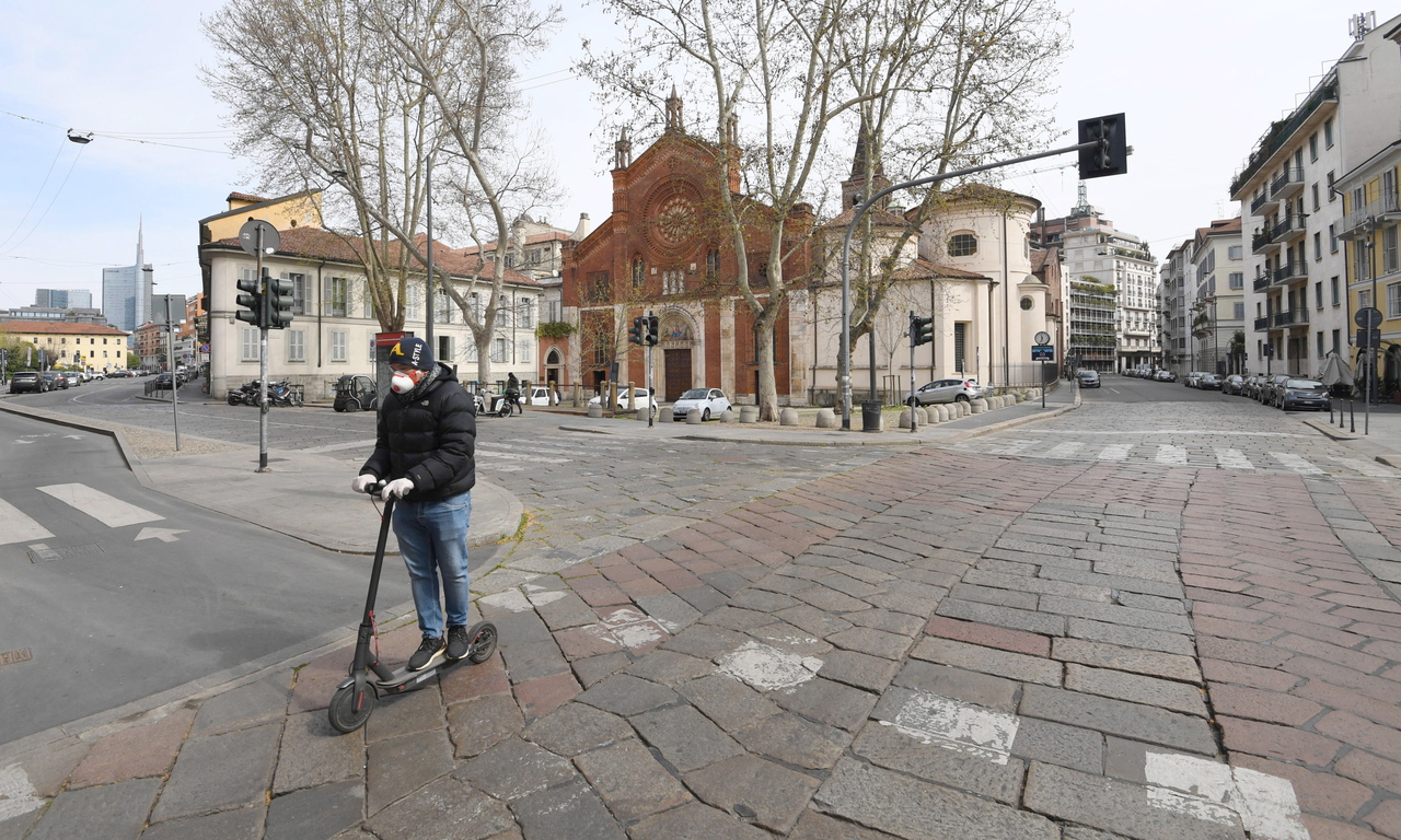 A man wearing a protective mask crosses on an electic scooter San Marco square deserted due to the nationwide lockdown, Milan, Italy, on March 27, 2020.