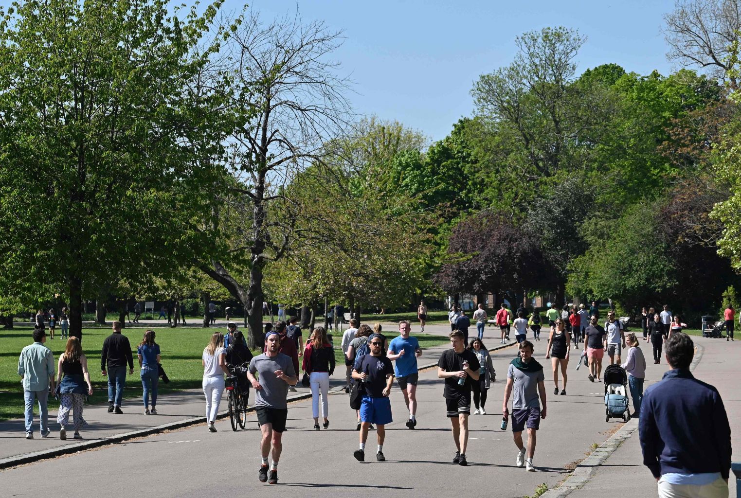 People walk in the sunshine in Victoria Park, east London, on April 25, 2020,