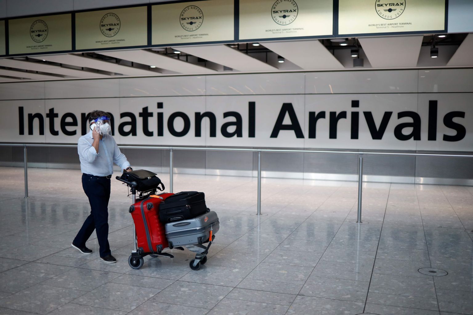 A passenger wearing a face mask and a visor arrives at Heathrow airport, near London.