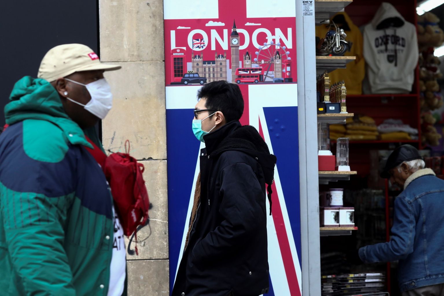 People wearing protective masks walk past a souvenir store on Oxford Street in London, March 14, 2020.