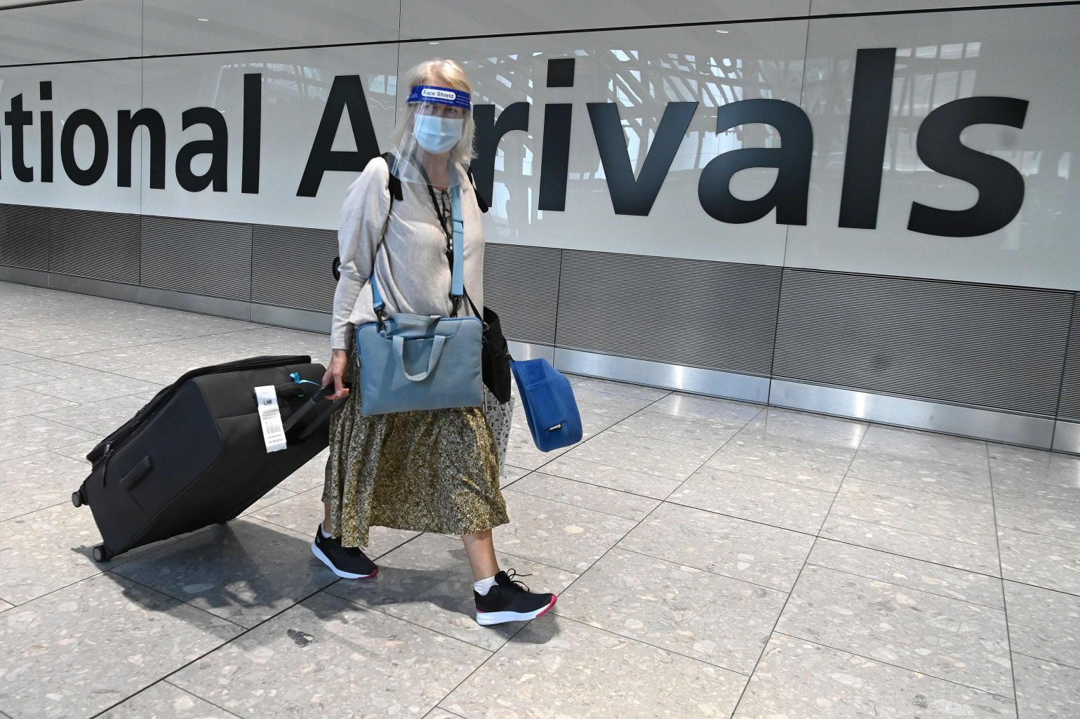 A passenger wearing face protection arrives at Heathrow airport, July 10, 2020.