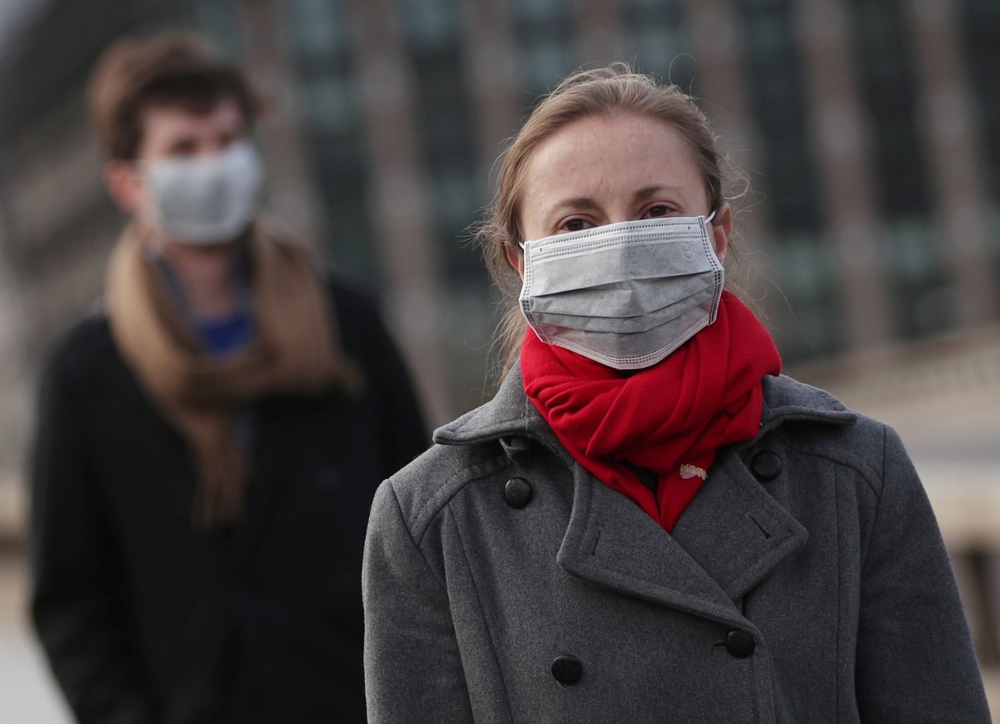 People wearing protective face masks walk across Westminster bridge in London, March 20, 2020.