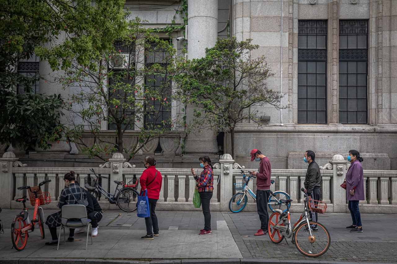 People stand in line outside a bank in Wuhan, on April 10, 2020.