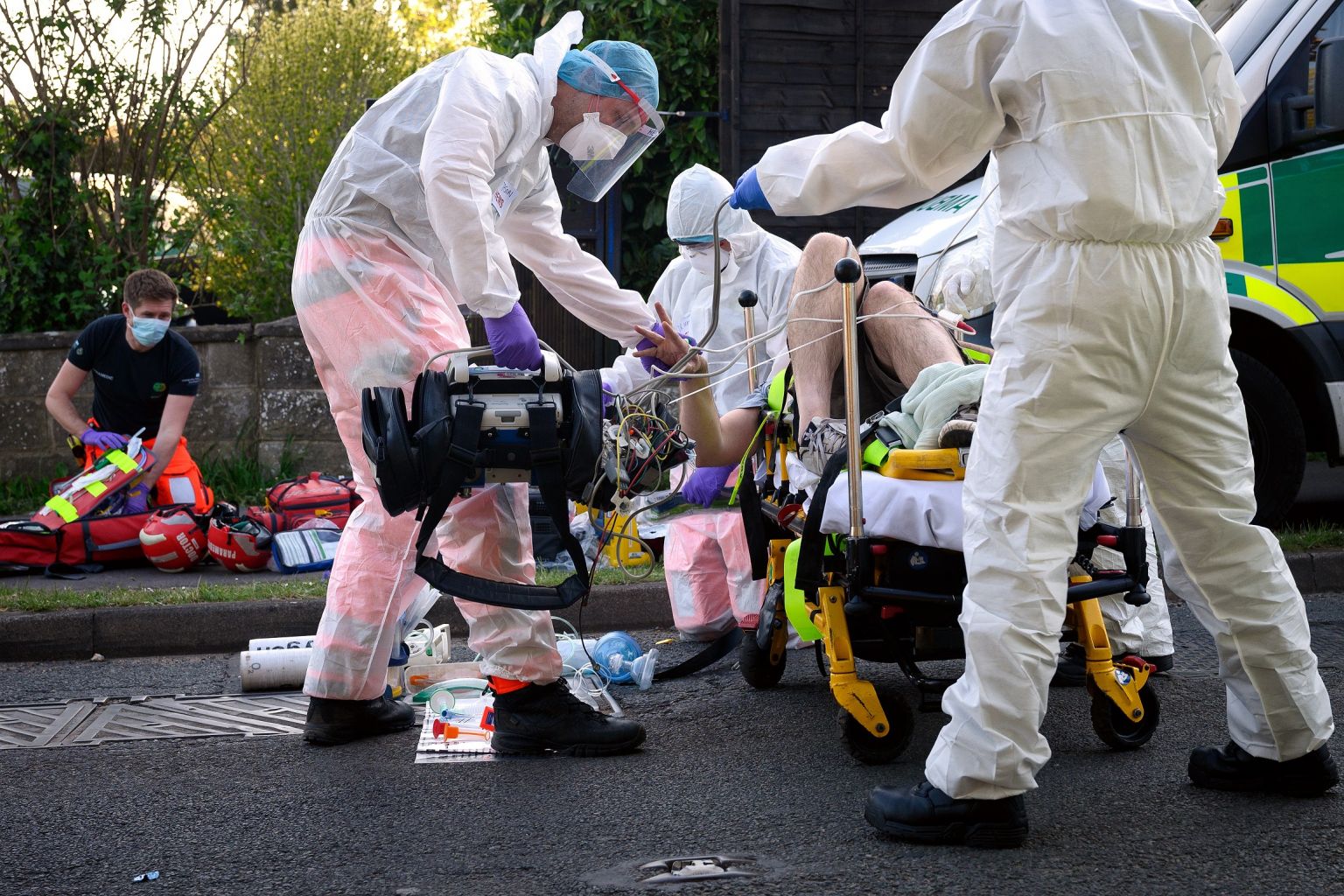 Medical crews work to stabilise a possible Covid-19 patient who was found unconscious having suffered a cardiac arrest while cycling, May 6, 2020.