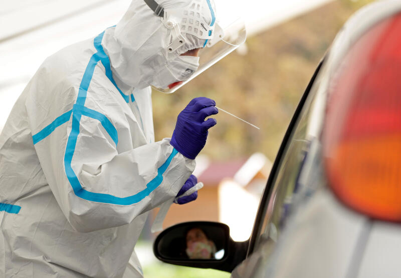 A healthcare worker taking a Covid-19 swab sample at a drive-in station in Prague, the Czech Republic, on Oct 7, 2020.