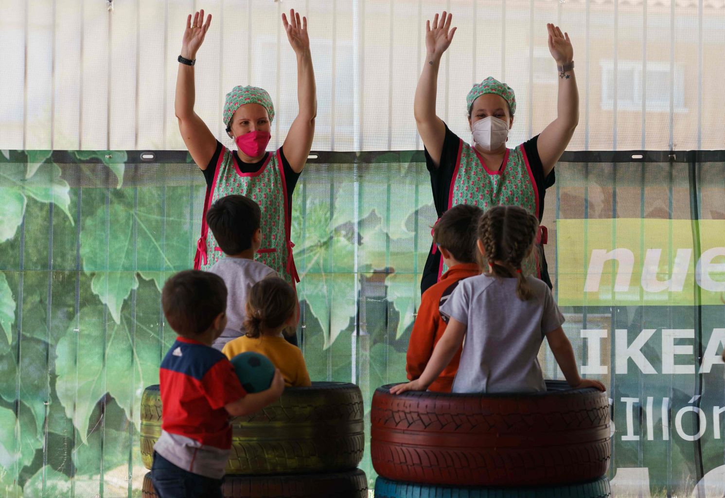 Teachers wearing face masks end children at a preschool in Valladolid, Spain, in June 2020.