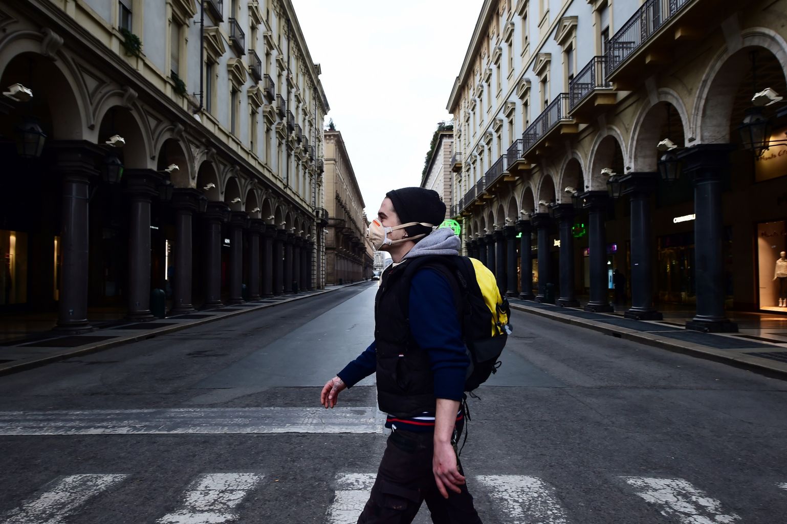 A person walks in a virtually deserted Via Roma, on the third day of an unprecedented lockdown across Italy.