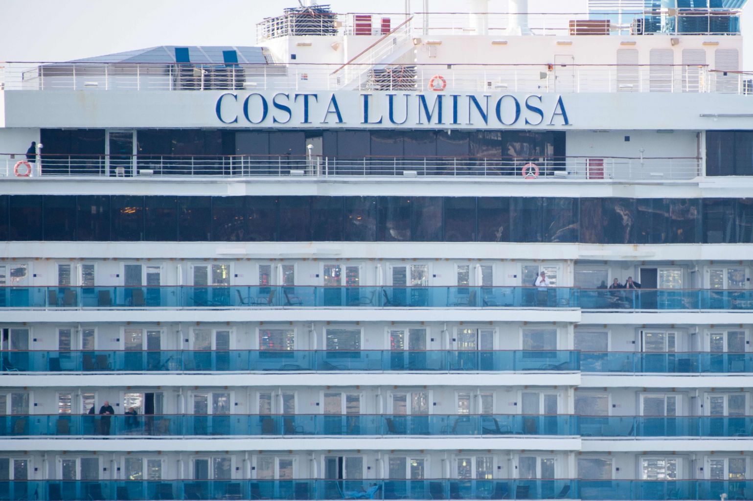 Passengers of the Costa Luminosa are seen as the ship is moored at Marseille harbour on March 20, 2020.