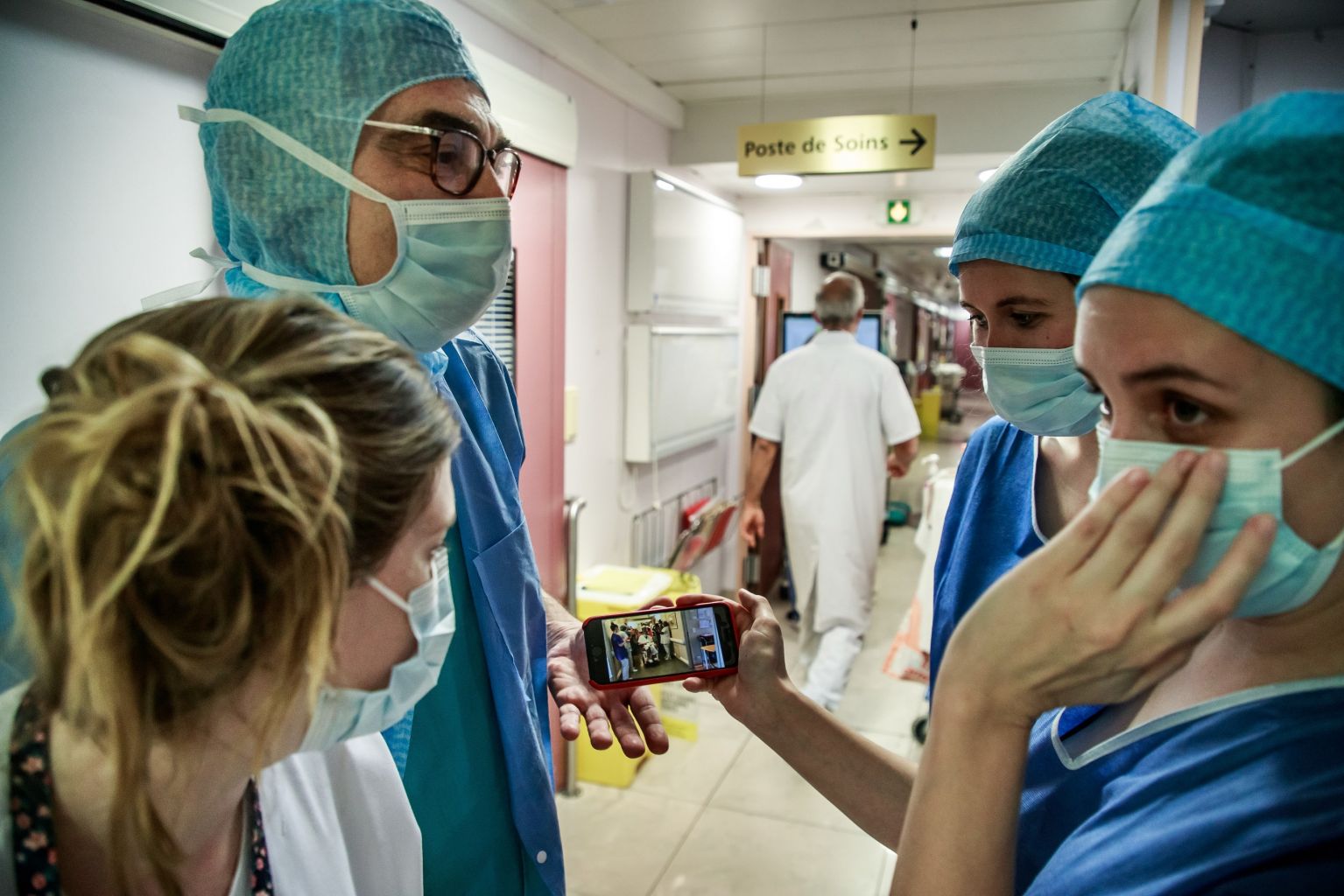 Doctors and nurses watch a video of one of their patients coming out of intensive care in Neuilly-sur-Seine, near Paris.