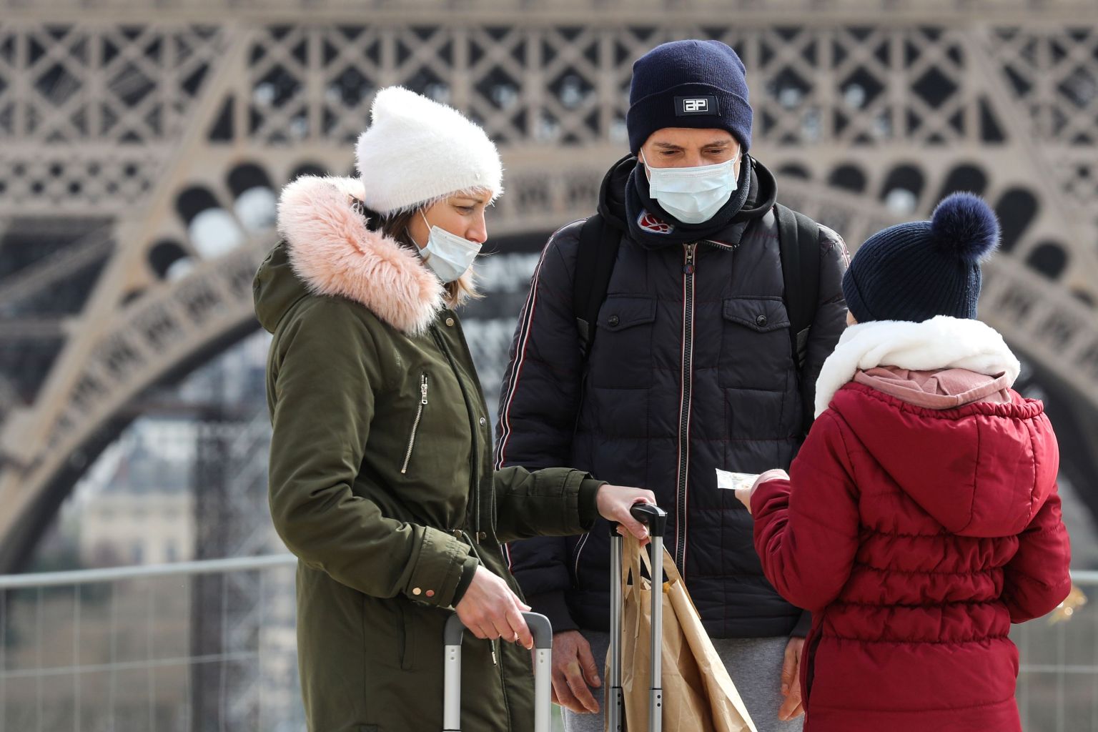People wear protective face masks as they walk in front of the Eiffel tower, March 12, 2020.