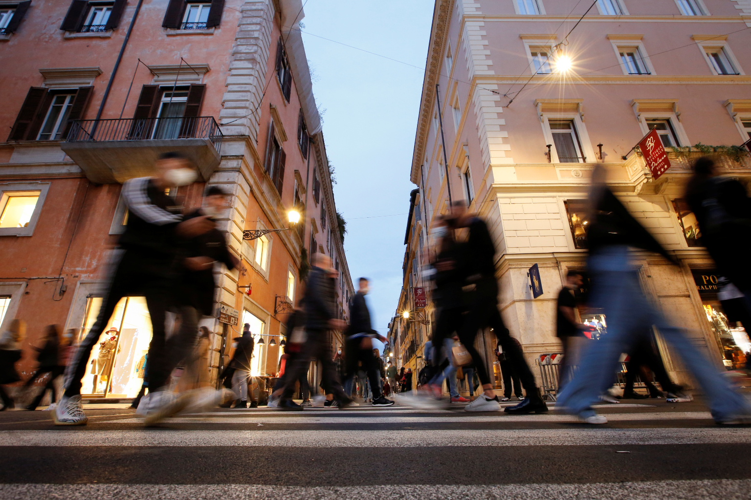 People walk along the shopping street of Via del Corso in Rome, on Nov 14, 2020.