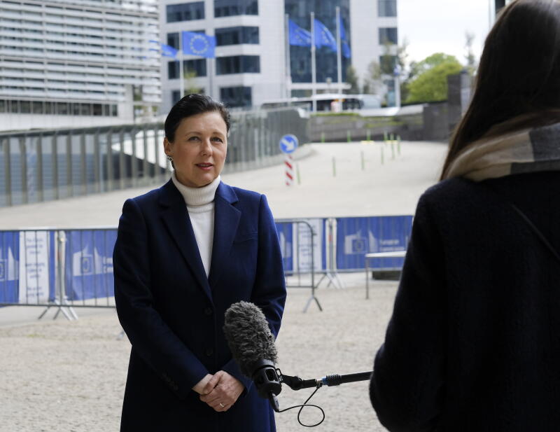 EU Commissioner for Values and Transparency Vera Jourova in an interview in Brussels, on April 14, 2020.