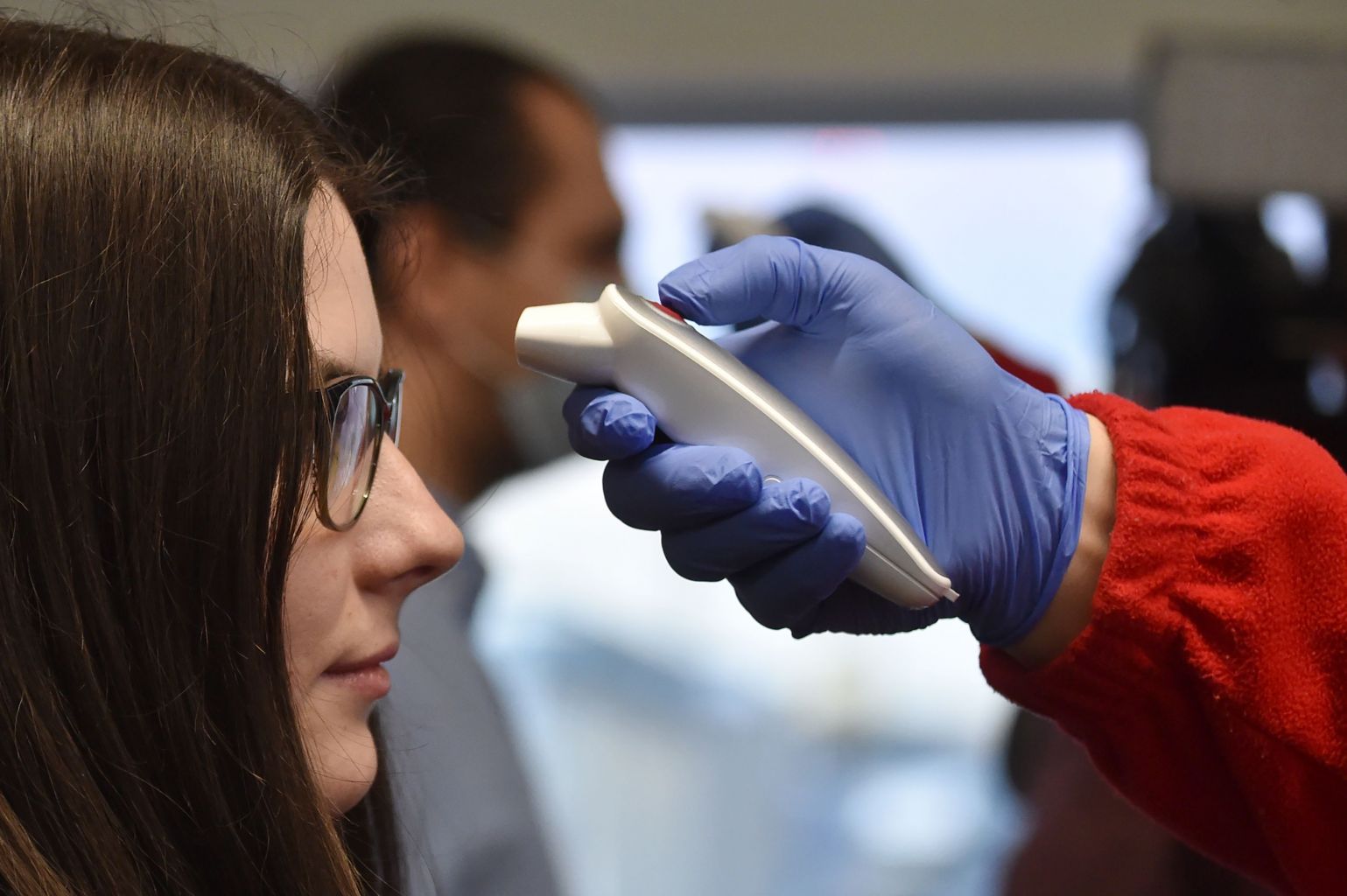 A woman's temperature is taken during a mock demonstration for the media at Budapest's Liszt Ferenc Airport on Feb 5, 2020.