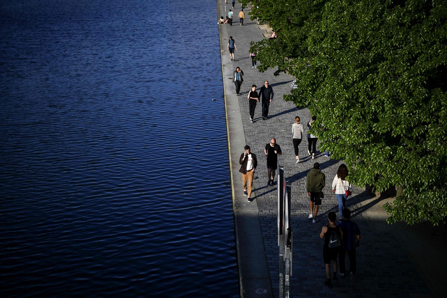 People walk and jog along the Canal de l'ourcq in Paris on April 22, 2020, during lockdown.