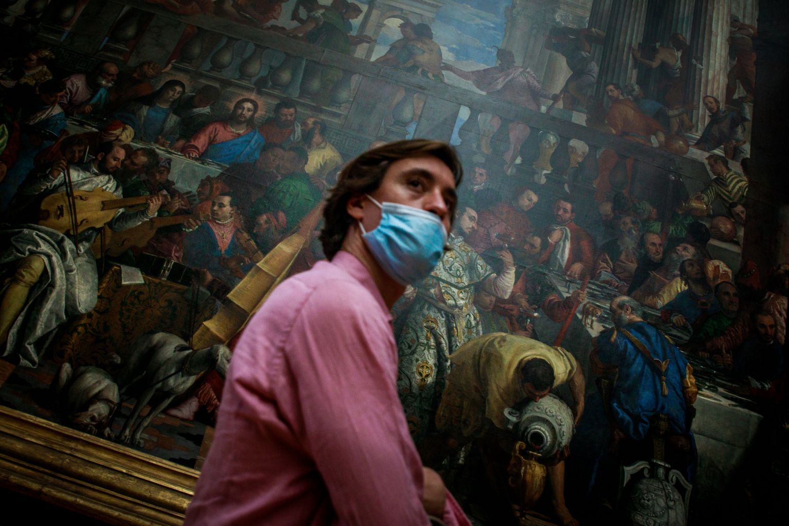 A visitor walks by a painting at the Louvre Museum in Paris, July 6, 2020.