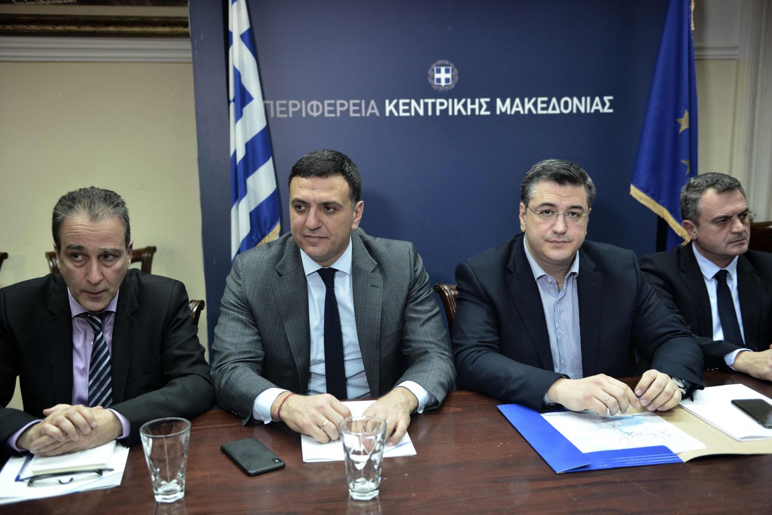 Greek Health Minister Vassilis Kikilias (second left) and Governor of Central Macedonia region, Apostolos Tzitzikostas, (second right) meet in Thessaloniki, on Feb 26, 2020.