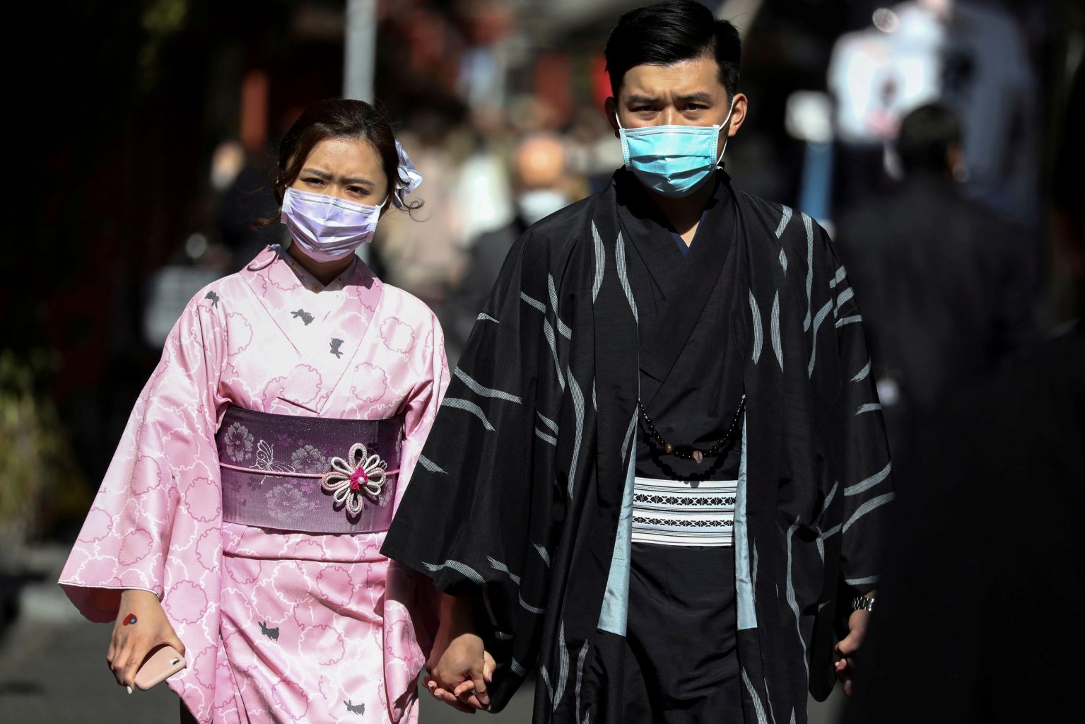 Tourists wearing kimono and protective masks visit Sensoji Temple in Tokyo, Japan, in February 2020.