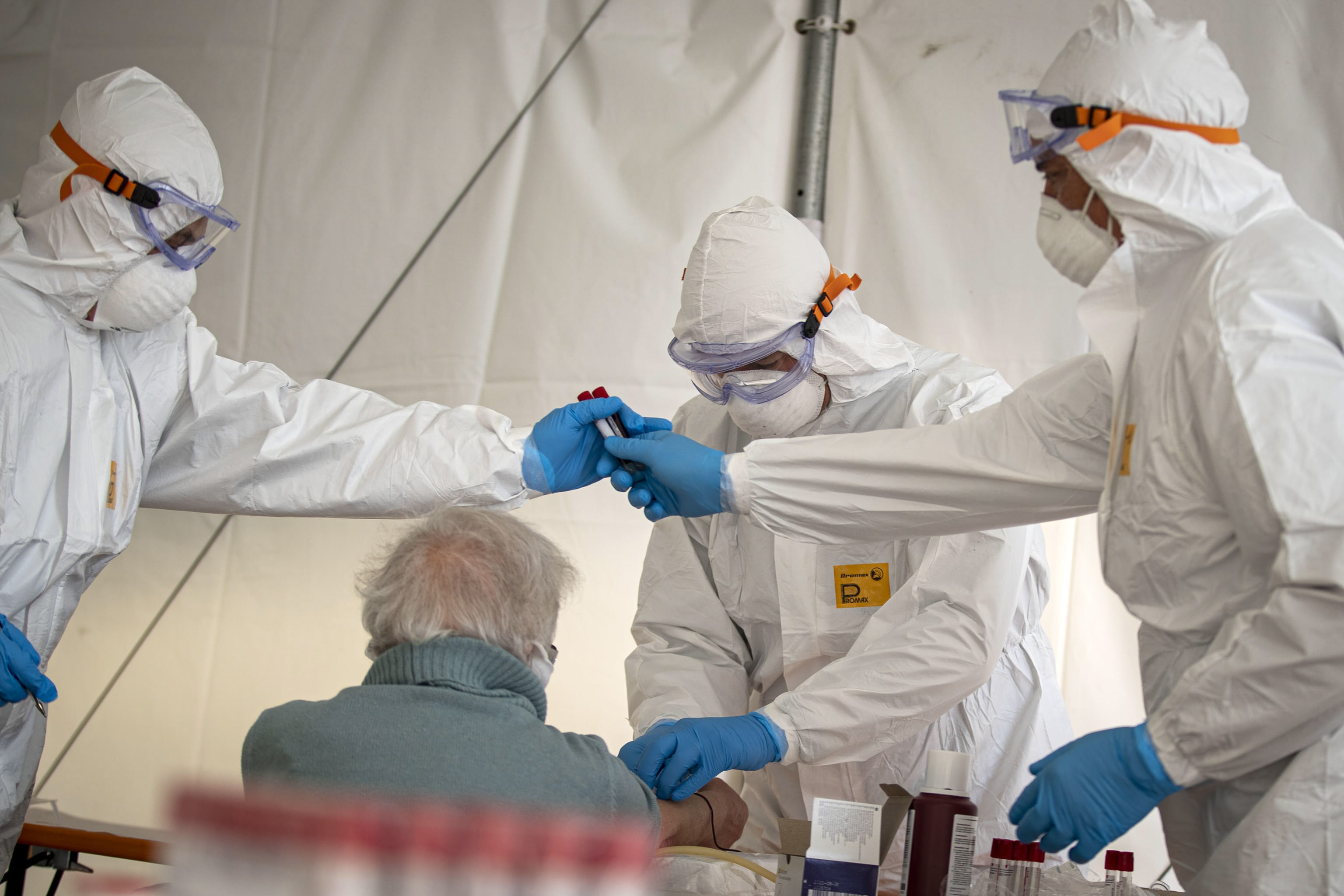 Health personnel perform blood tests and monitoring activities in Nerola, Italy, on March 31, 2020.