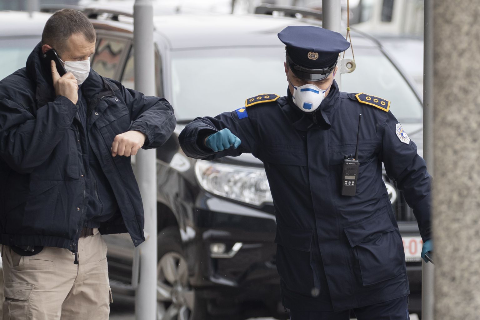Kosovo police officers wearing face masks greet each other while on patrol in front of the parliament building in Pristina, March 25, 2020.