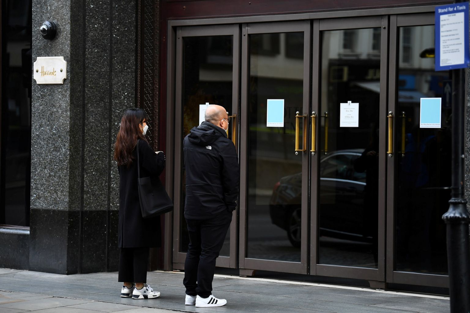 A couple wearing masks read a notice outside Harrods store in central London.