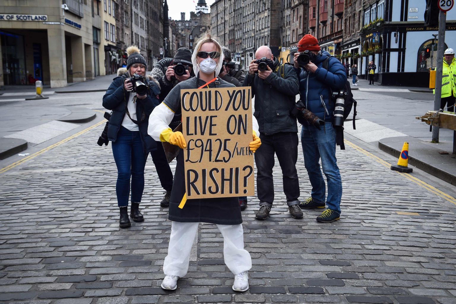 A woman wearing a protective face mask and gloves holds a placard complaining about the lack of suport for the self-employed and zero hours contract workers, in Edinburgh on March 23, 2020.