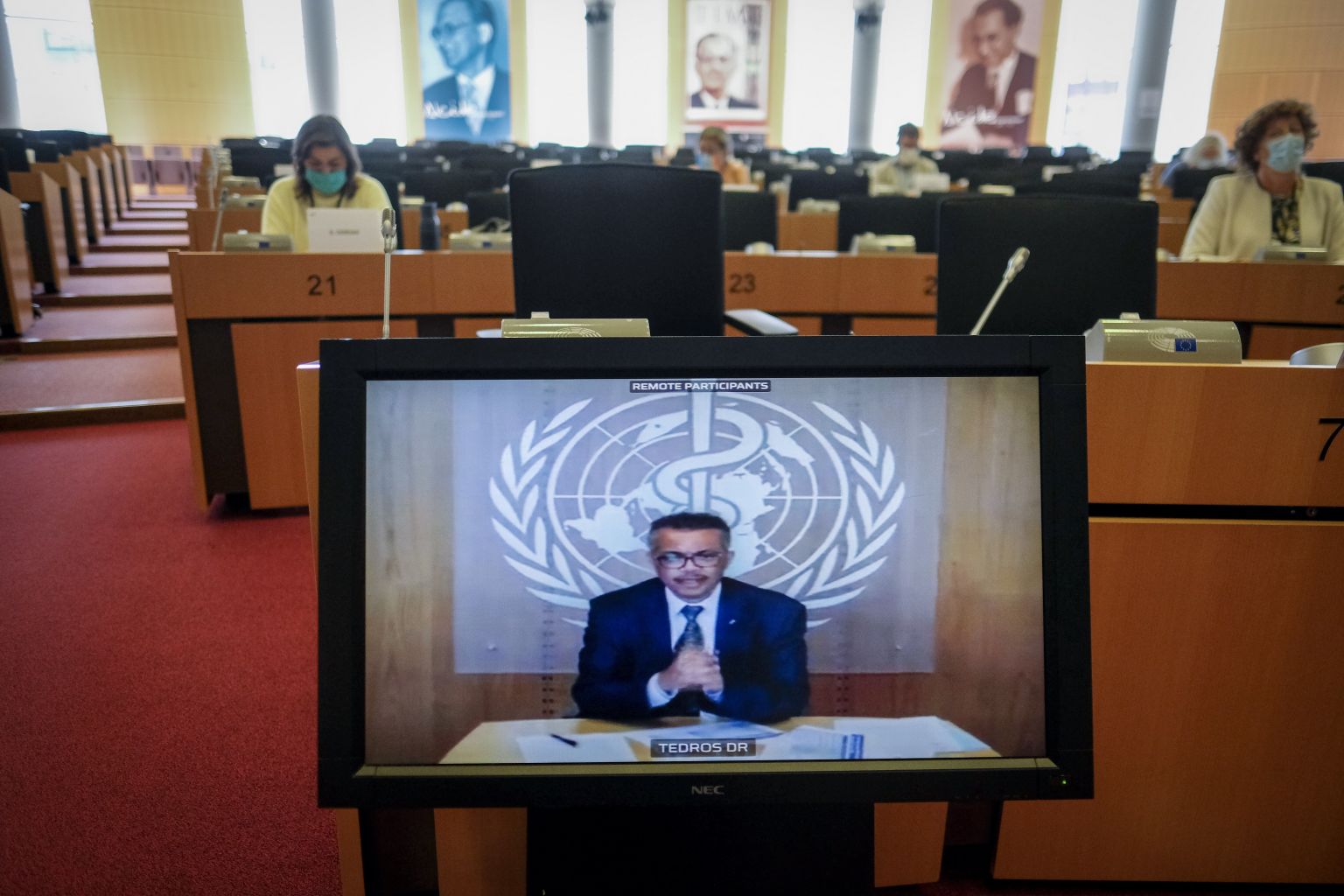 WHO chief Tedros is seen on a screen during a video hearing on EU strategy for Covid-19 in Brussels, June 25, 2020.