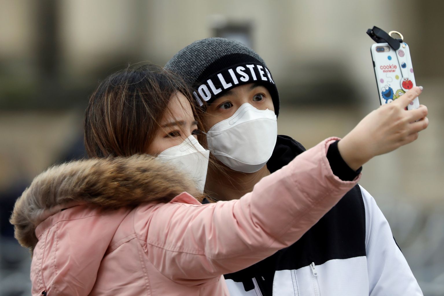 A couple wearing masks poses for a selfie near the Louvre Pyramid in Paris.
