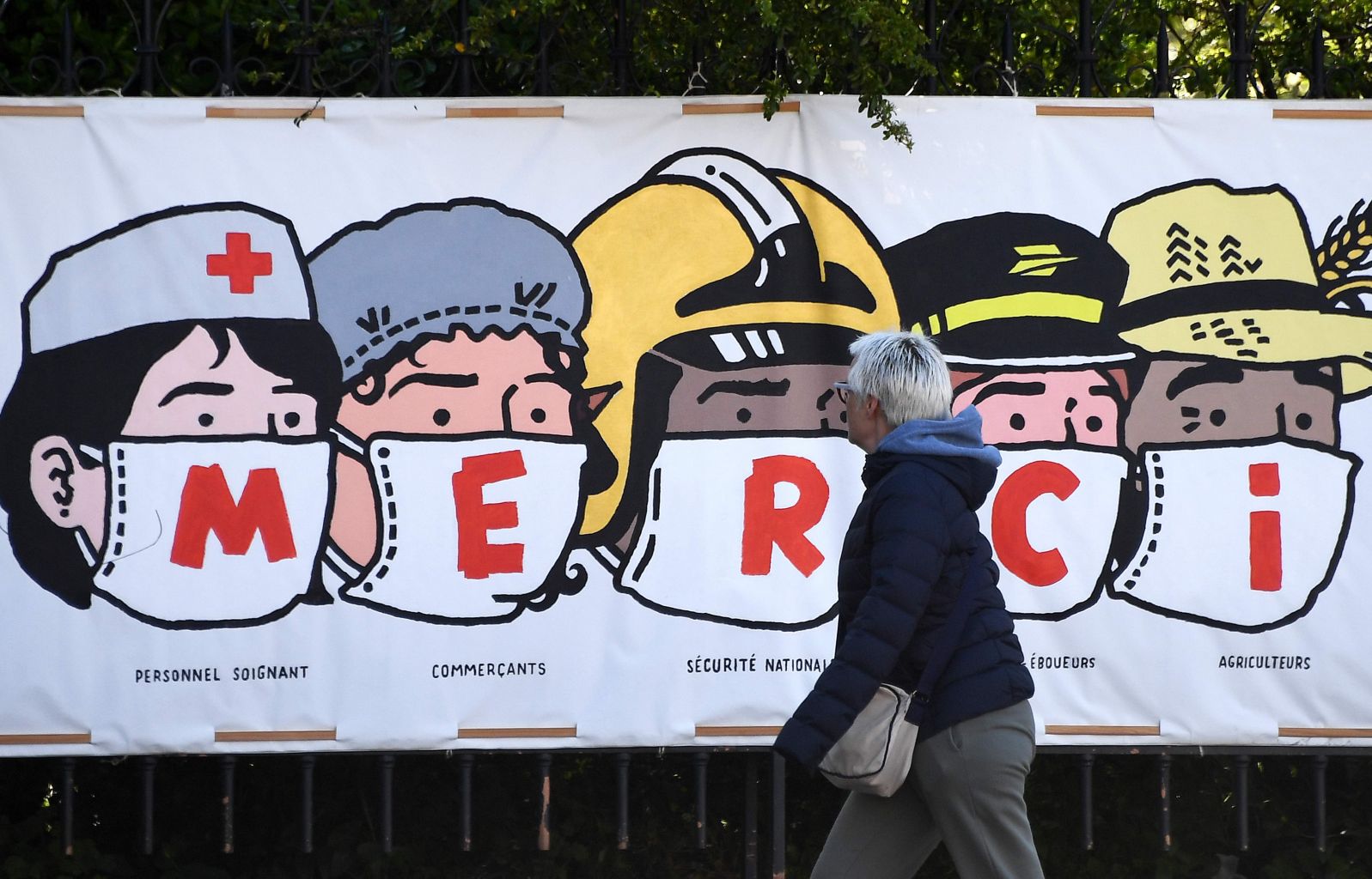 A person walks past a poster thanking healthcare workers, shopkeepers, French national security personnel, post office staff and farmers in Paris.