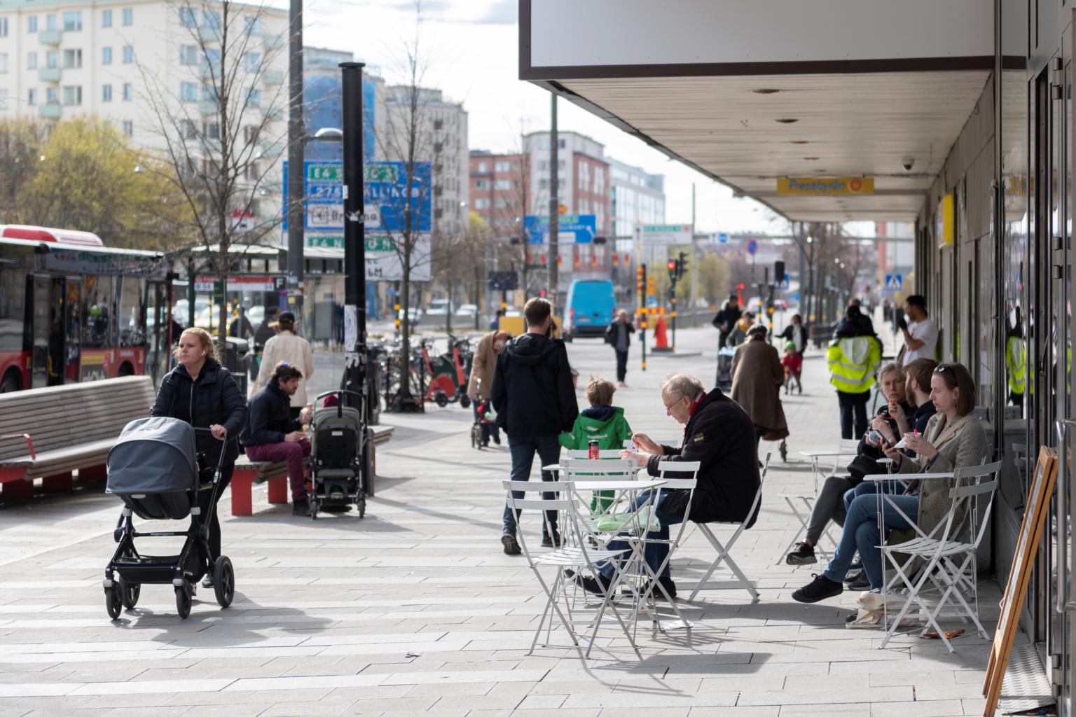 People sitting at an outdoor cafe amid the coronavirus outbreak, in Stockholm, Sweden, on April 20, 2020.