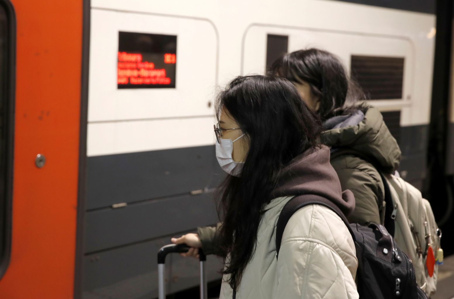 A traveller wears a mask as she stands in front of a train at the central station in Bern, Switzerland, Jan 28, 2020.