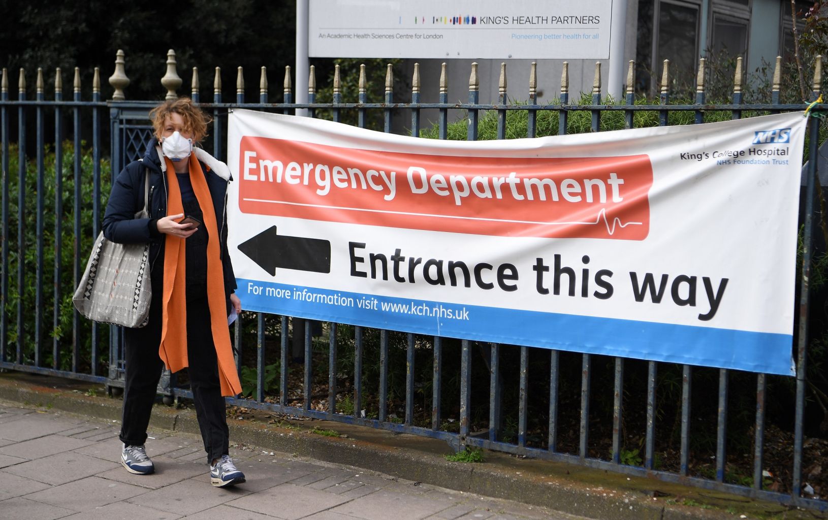 A woman wearing a protective mask walks past a sign at Kings College hospital in London.