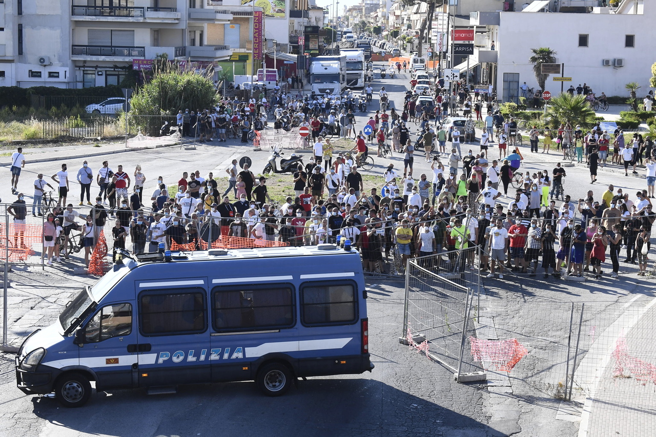Neighborhood people protest against residents living in a building inside the red zone, in Mondragone, Italy, on June 25, 2020.