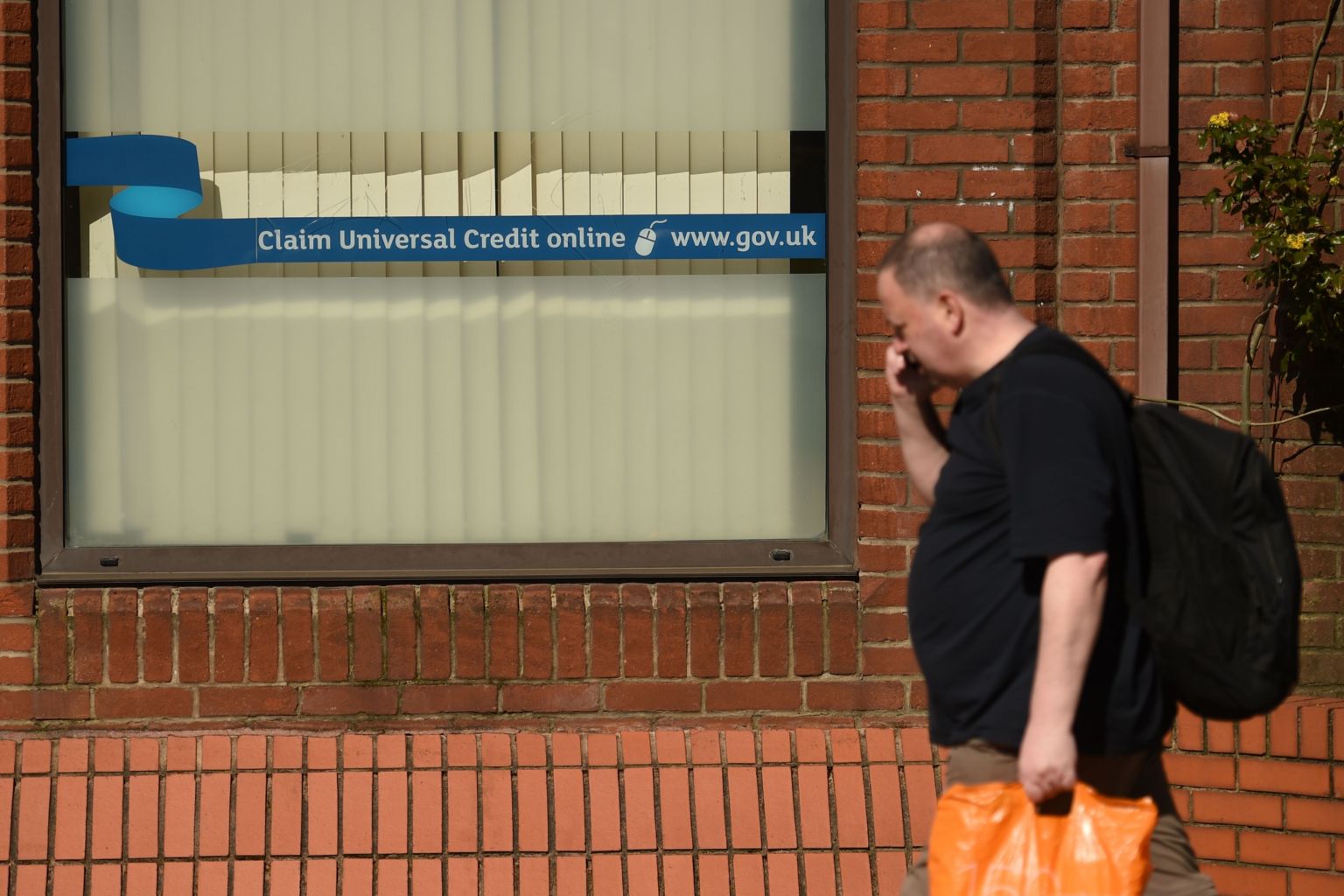 A man walks past a sign with the email address of 'universal credit' in England on March 26, 2020.