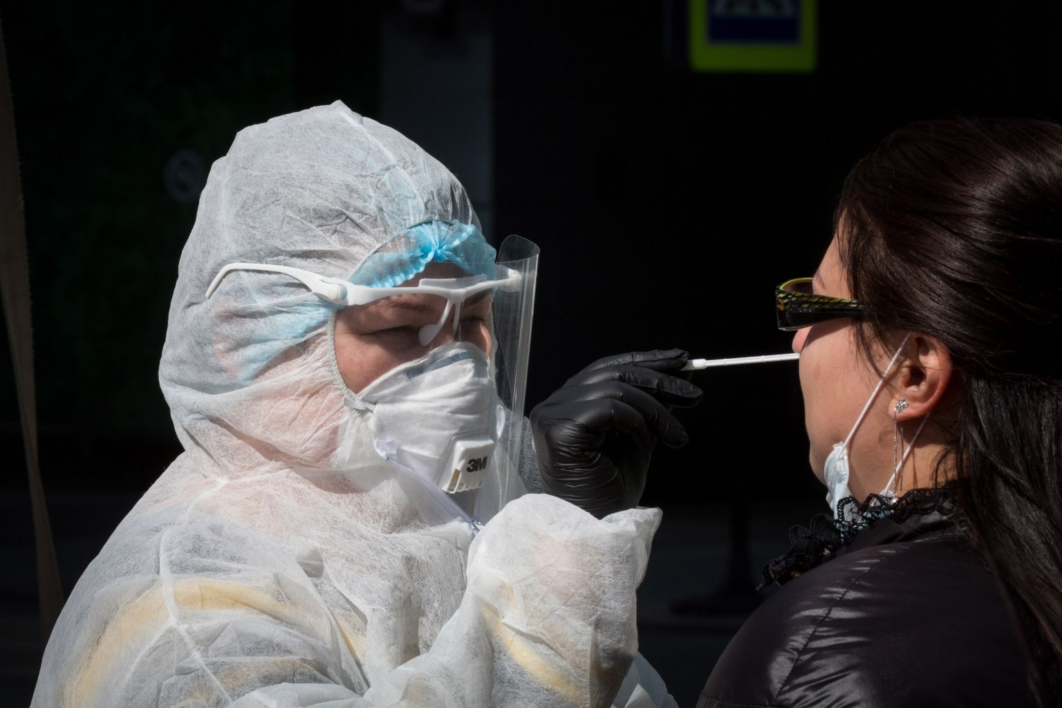 A medical worker takes a sample from a visitor to a mobile Covid-19 sample collection site in Moscow, April 28, 2020.