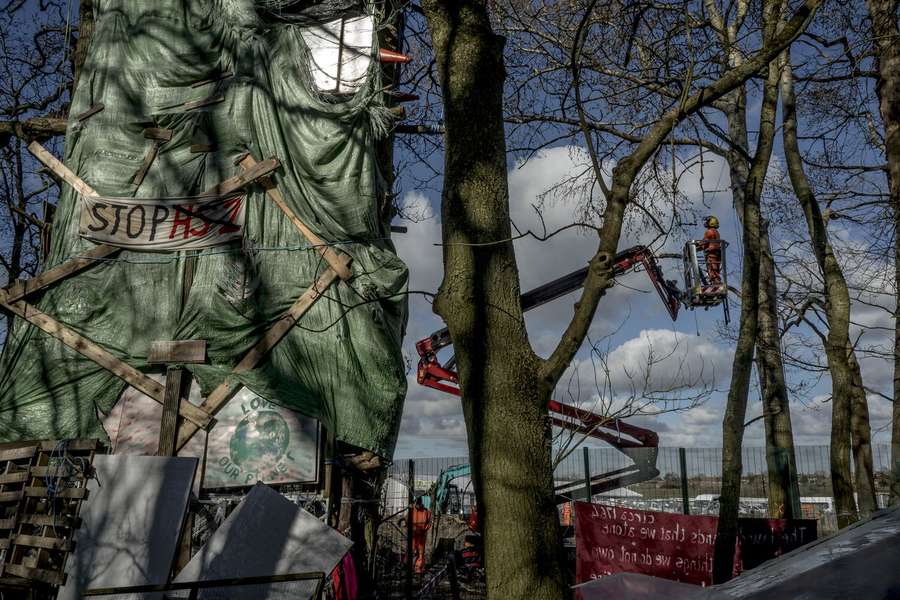 At a protest camp at Jones Hill Wood, about 25 miles from Steeple Claydon, activists have built tree houses and other shelters on a landscape that inspired writer Roald Dahl, and where tree felling was scheduled last year.
