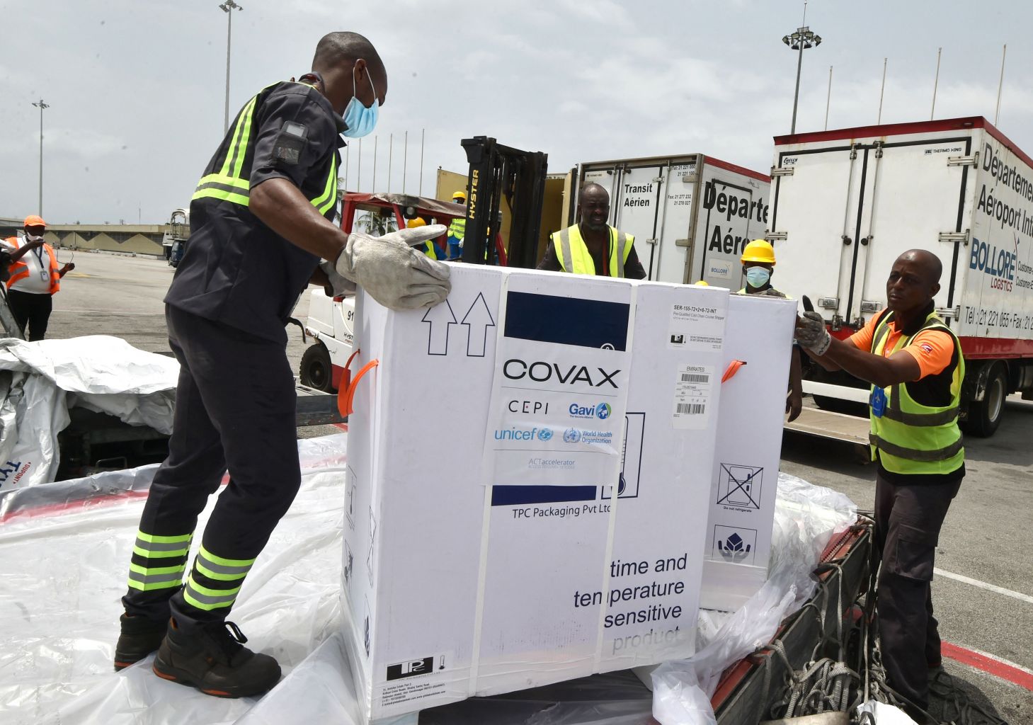 Workers unload a shipment of AstraZeneca Covid-19 vaccines bearing Covax stickers from a plane at Felix Houphouet Boigny airport of Abidjan on Feb 26, 2021.